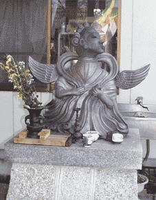 当寺の本堂への階段の横に写真の像が置かれています。近所の人はこの像を「御還り天子」と呼び、本堂に上がられる前に必ずお参りされます。